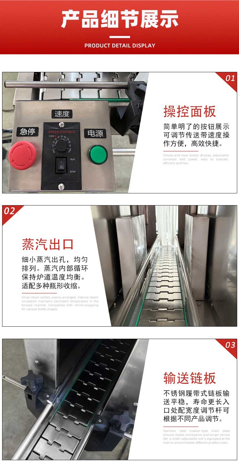 • 輸送系統:用于平穩傳送待包裝的產品,使其能在收縮室內均勻接受蒸汽作用。